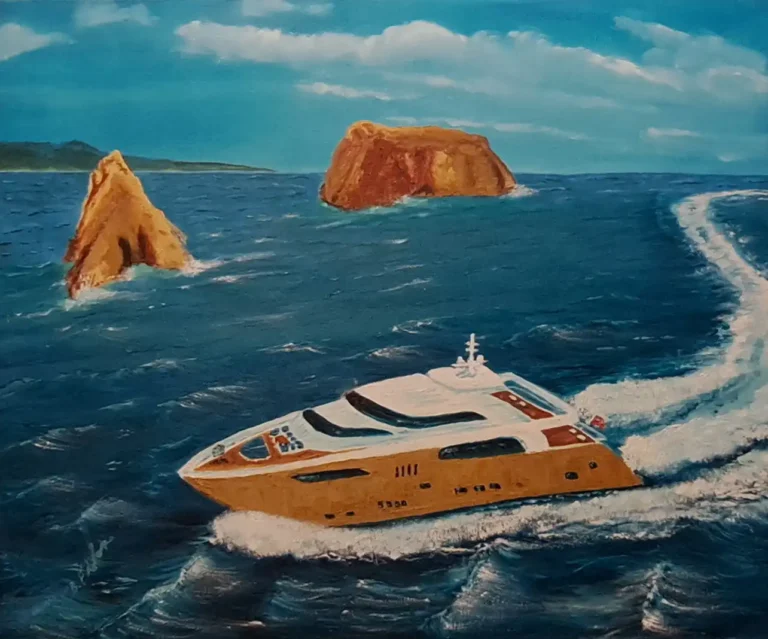 Titel: Yacht manövriert um die Felsen herum Grösse: 55 x 45 cm Maltechnik: Ölfarbe auf Baumwoll-Leinwand aufgezogen auf Holzkeilrahmen Preis Original: auf Anfrage Preis Druck: auf Anfrage Kaufen